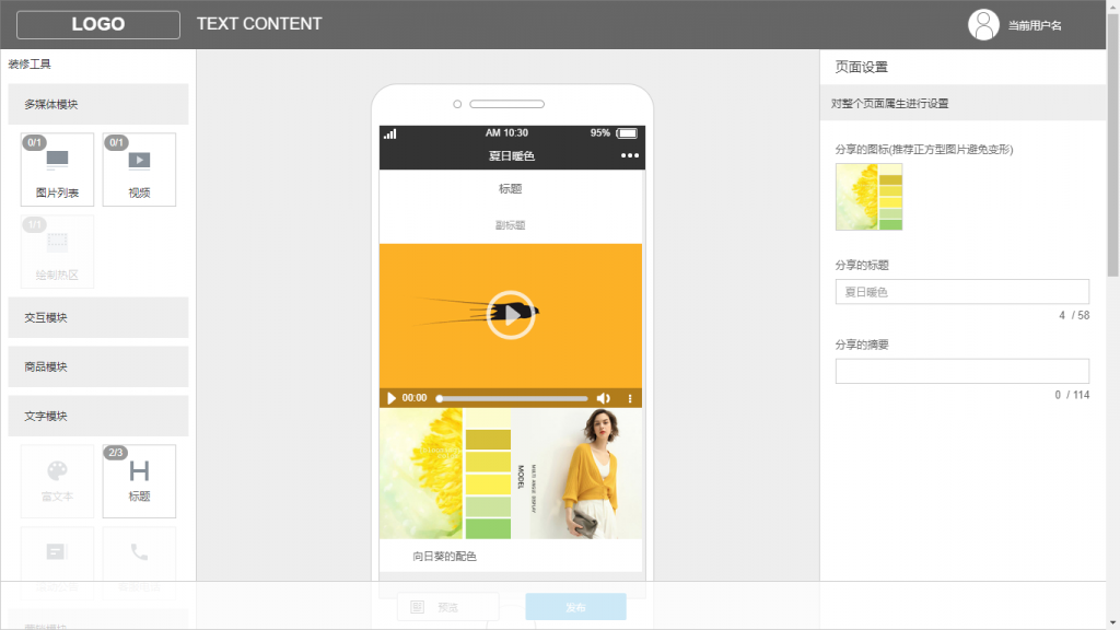 本次的挑战的工具使用Axure8.0版。项目选择了作者公司中交互较为复杂的移动端商城装修功能。此功能让用户在PC端通过所见即所得的编辑方式,将移动端常见的展示效果,像搭积木一样,组合设置成为用户需要的移动端商城的样式。(如下图)